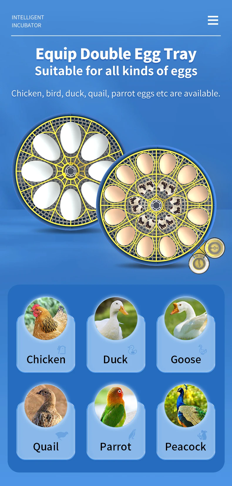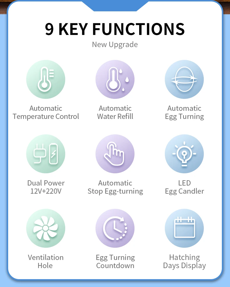 يأتي هذا المفقس بسعة 18 بيضة مع نظام ذكي للتقليب التلقائي يحاكي ظروف الفقس الطبيعية لرفع نسبة النجاح. يمكنك ضبط فترة التقليب على 60 أو 120 أو 180 دقيقة. كما يحتوي النظام على مؤقّت عدّ تنازلي ويتوقف عن التقليب تلقائياً قبل 3–4 أيام من الفقس لحماية البيض من الحركة الزائدة.