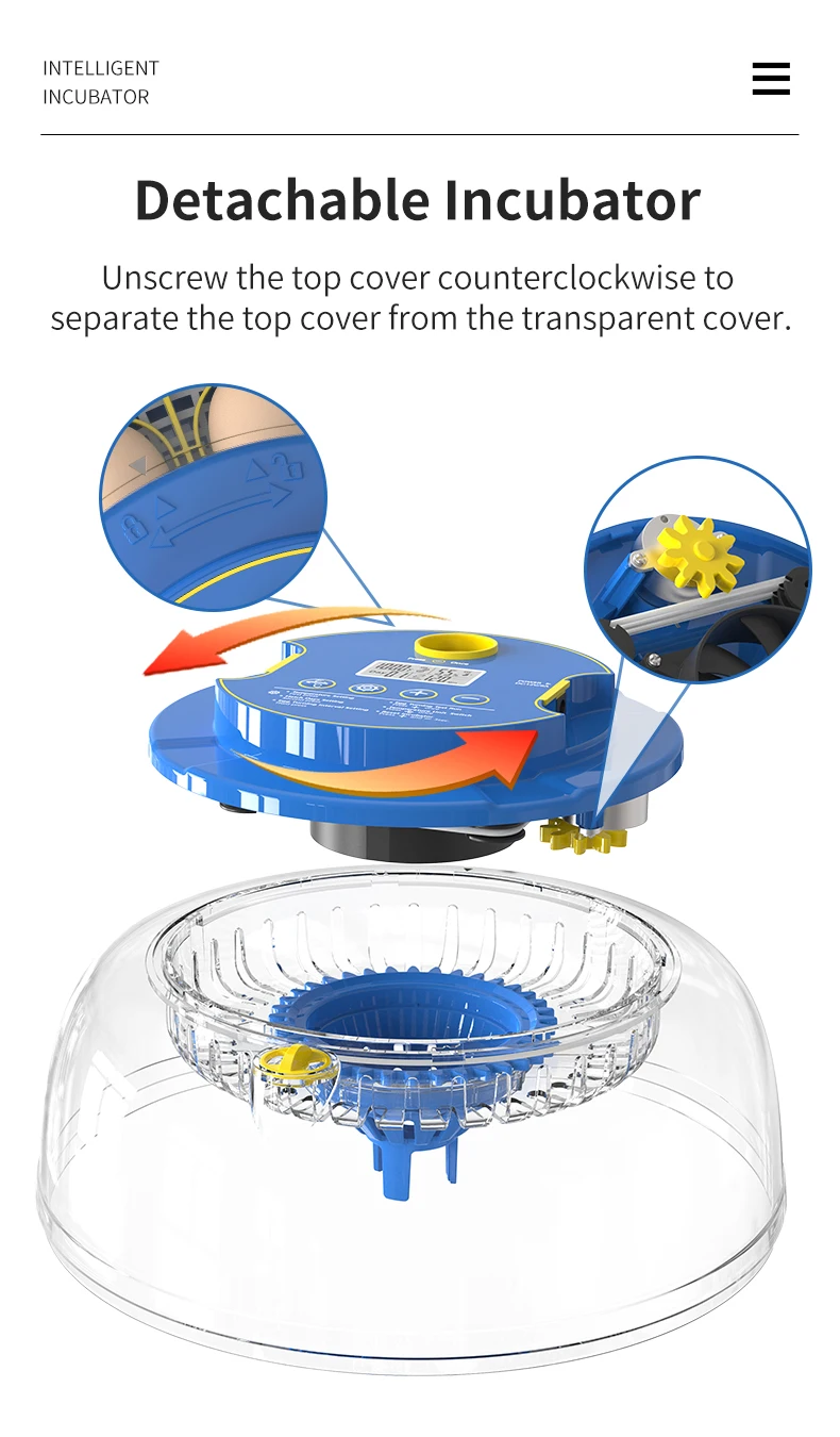 يتميز المفقس بتصميم شفاف بالكامل يتيح لك رؤية 360 درجة لمراحل الفقس دون الحاجة لفتح الغطاء. كما أن الهيكل قابل للفك بسهولة، حيث يمكن فتح غطاء التهوية العلوي بسهولة، ويمكن غسل الصينية السفلية بالماء لإعادة الاستخدام—مما يحافظ على النظافة ويطيل عمر الجهاز.