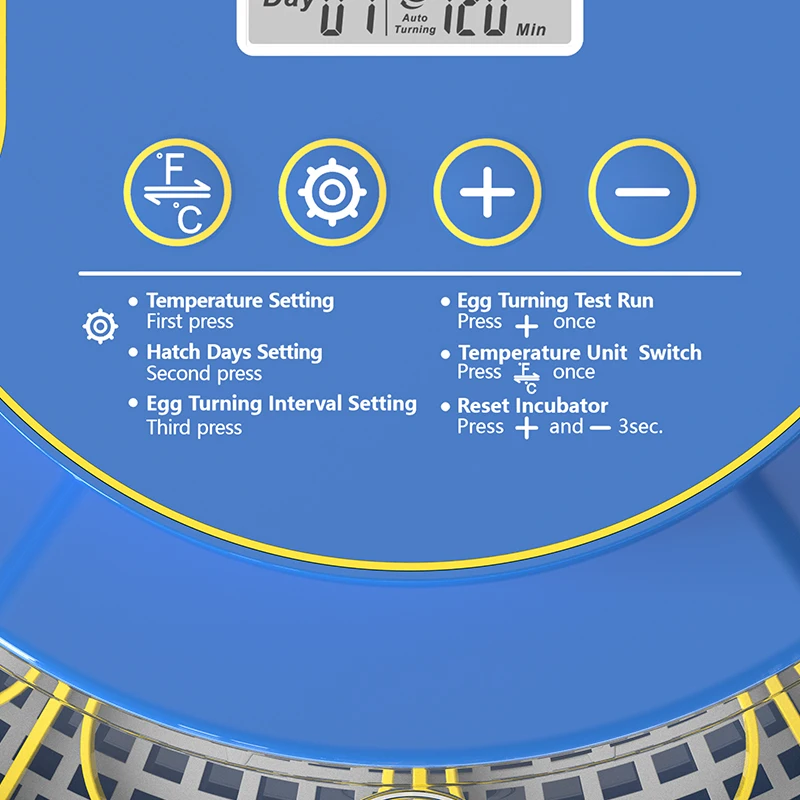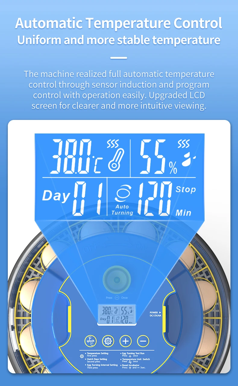 يوفر المفقس نظام تحكم متقدم يحافظ على ثبات درجة الحرارة والرطوبة. شاشة LED مدمجة تتيح ضبط الحرارة بسهولة (بالفهرنهايت)، بدون الحاجة لأجهزة إضافية. كما يعمل الجهاز بهدوء شديد لتوفير بيئة مستقرة ومناسبة للفقس.